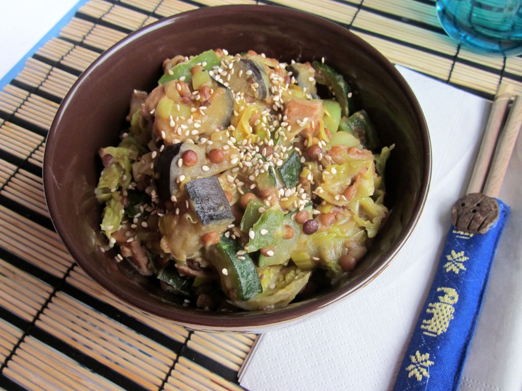 Salteado verde con lentejas y salsa de cacahuete.